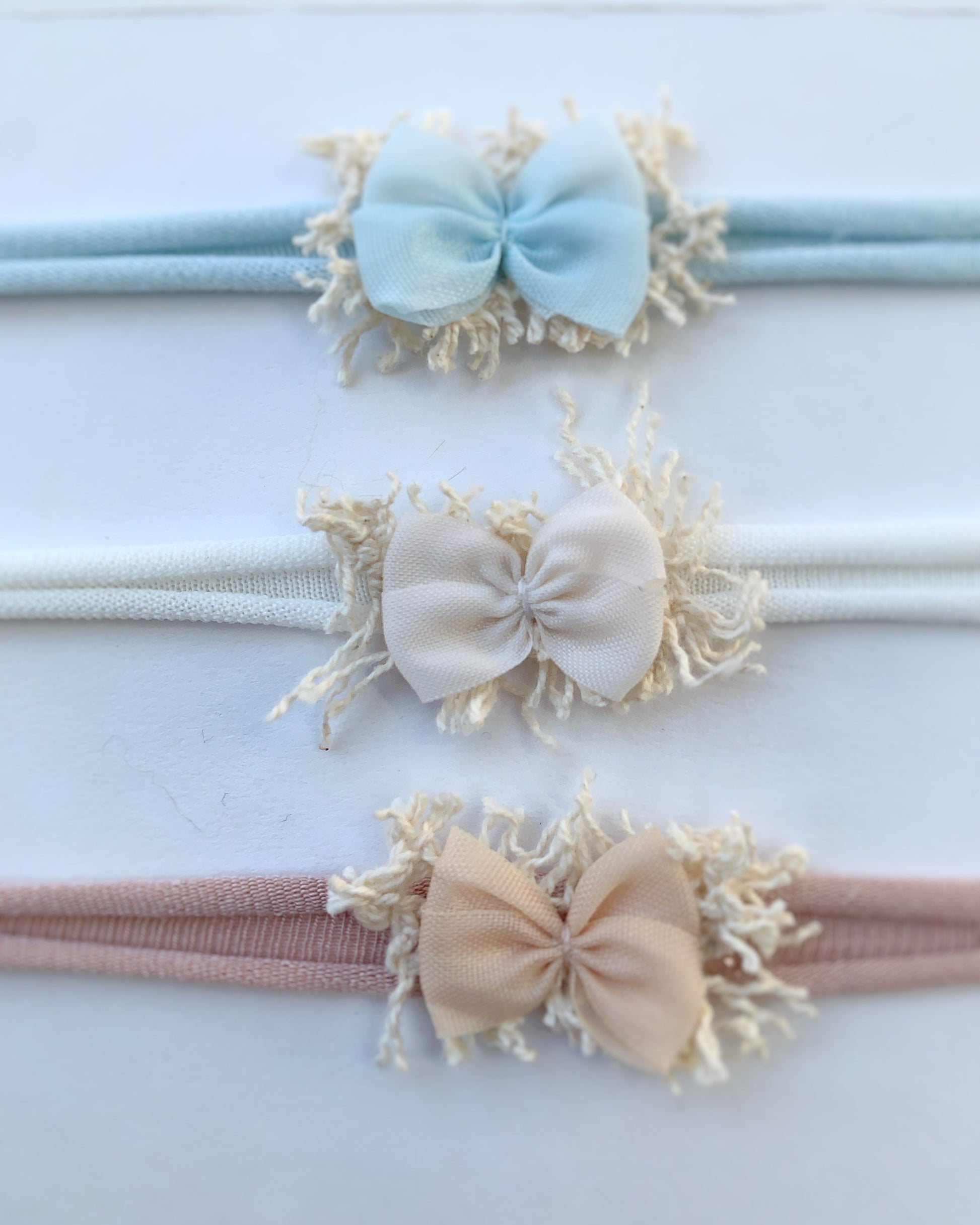 Delicate newborn mini bow headband set in ivory, light blue and dusty pink. Super delicate and minimalistic baby tieback accessory.